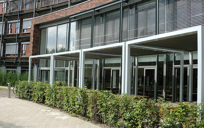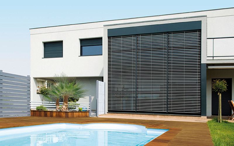 Mit außenliegenden Raffstoren lässt sich die Sonnenstrahlung ins Rauminnere einfach und nutzergerecht steuern – neben optimalem Sonnenschutz bleibt auch die Sicht nach draußen erhalten. Eine vorteilhafte Alternative bieten je nach Anforderung auch wetterfeste und extrem robuste Textilscreens.